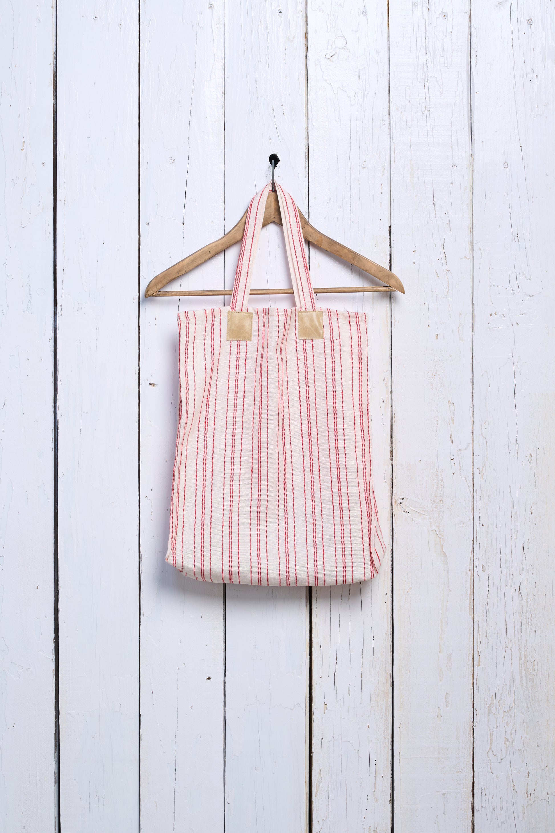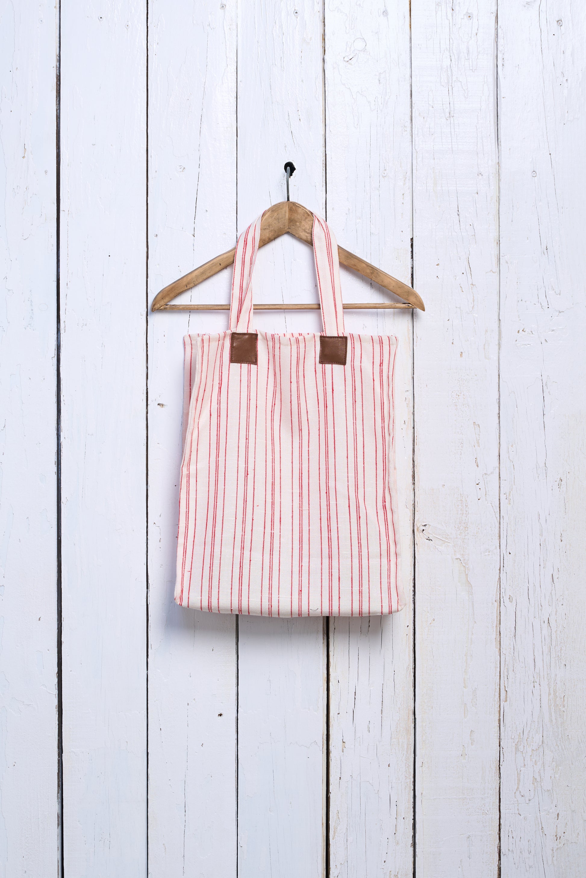 This limited edition beach bag is made with unique vintage linen from the 1950s. The leather detail is made from dead-stock leather swatches.