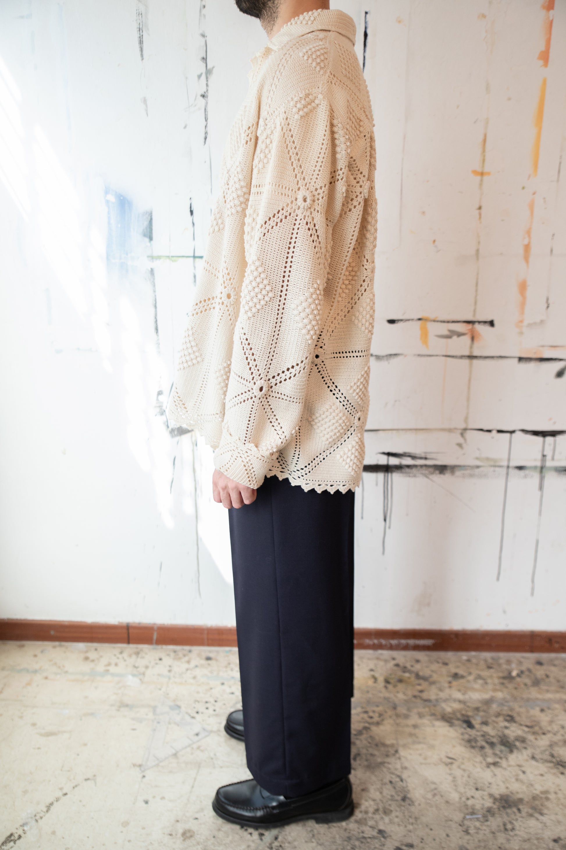Crafted from an antique crochet tablecloth, this overshirt showcases intricate hand-made patterns from the past. Its open texture and graphic motifs give the piece an unmistakable presence.